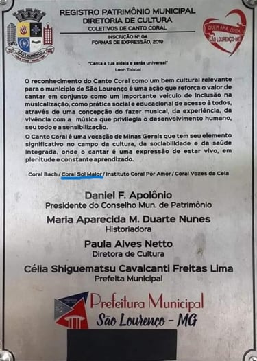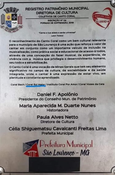 Fundado em 2005 por membros da Sociedade Brasileira de Eubiose, o Coral Sol Maior nasceu em São Lourenço, Minas Gerais, com o propósito de promover a integração por meio da música e da expressão artística coletiva. Ao longo dos anos, tornou-se um dos grupos vocais mais respeitados da região, mantendo viva a tradição do canto coral e enriquecendo a cena cultural local. Os ensaios do coral são realizados na Fundação Henrique José de Souza, que gentilmente cede este espaço a título de cortesia, apoiando de forma significativa este projeto artístico e cultural.